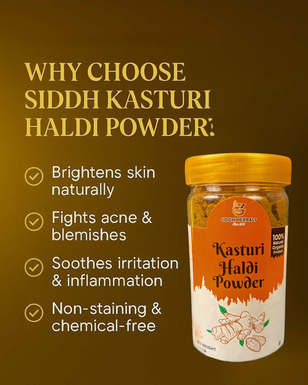 Ingredient: 100 percent Natural and Organic Kasturi Haldi